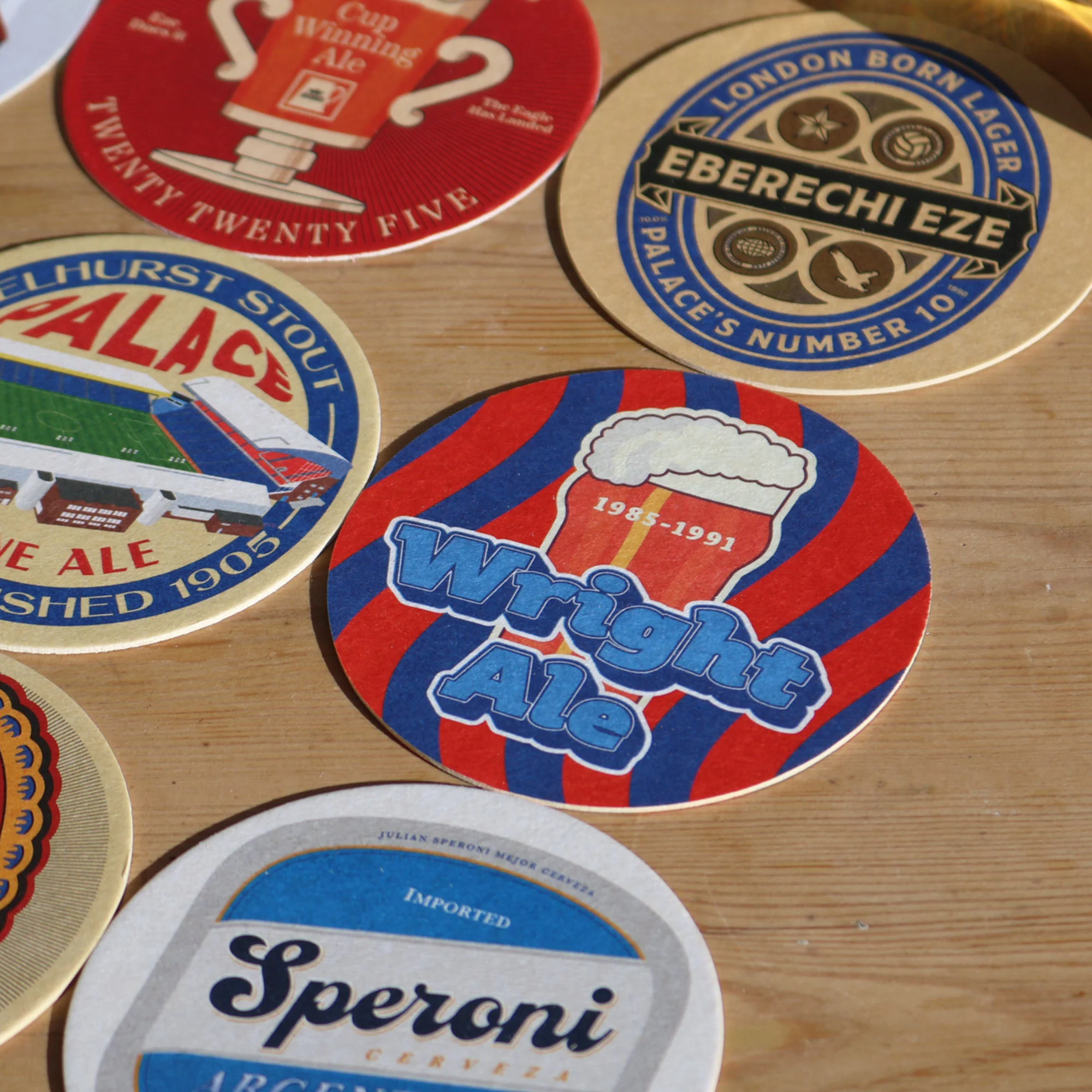 Each pack of beer mats contains 9 unique Palace designs inspired by the players, their nations, moments in the club's history and the home of The Eagles, Selhurst Park. Printed on traditional pulp, our mats give you the authentic look and feel of a beer mat from the local.